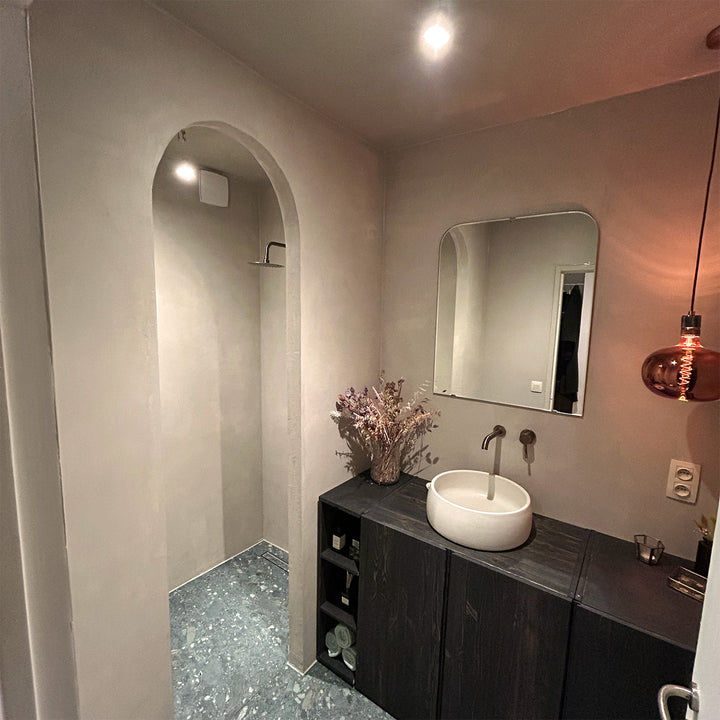 Een oppervlak in beton is vrij poreus. Dit maakt dat het oppervlak niet volledig watervast is en er kunnen zich ook vuil en vetresten in nestelen. Als je een oppervlak in beton volledig waterdicht en onderhoudsvriendelijke wil maken, gebruik je onze Beton Ciré coating. Het maakt de poriën in het beton dicht en legt een beschermlaag over het beton heen. Daardoor kun je het makkelijk schoonhouden. Afnemen en afwassen is geen enkel probleem. In ruimtes die extra bescherming nodig hebben (zoals een douche of de vloer) adviseren wij 2 toplagen om je Beton Ciré te beschermen.
