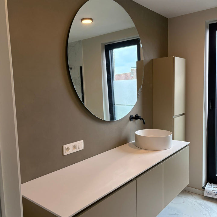 Een oppervlak in beton is vrij poreus. Dit maakt dat het oppervlak niet volledig watervast is en er kunnen zich ook vuil en vetresten in nestelen. Als je een oppervlak in beton volledig waterdicht en onderhoudsvriendelijke wil maken, gebruik je onze Beton Ciré coating. Het maakt de poriën in het beton dicht en legt een beschermlaag over het beton heen. Daardoor kun je het makkelijk schoonhouden. Afnemen en afwassen is geen enkel probleem. In ruimtes die extra bescherming nodig hebben (zoals een douche of de vloer) adviseren wij 2 toplagen om je Beton Ciré te beschermen.